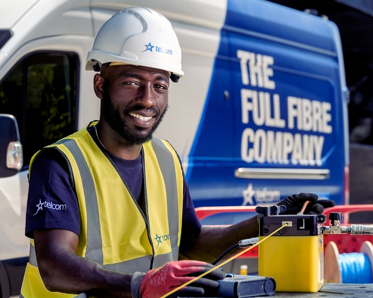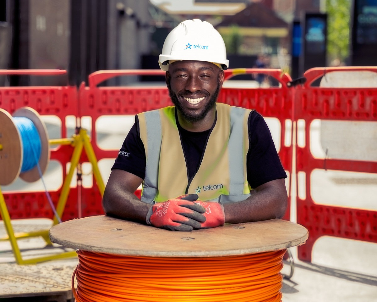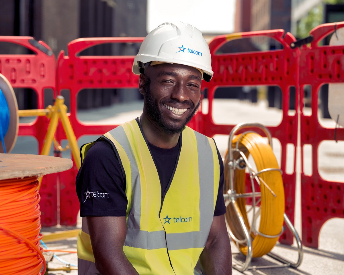 For the website’s hero images, we chose a composition that is both technically engaging and human-centred. The centrepiece: a Black engineer confidently splicing fibre‑optic cables while smiling at the camera—a deliberate choice to reflect the diversity and values driving Telcom forward. By blending human warmth with technological precision, the image speaks to both professionalism and inclusivity.
