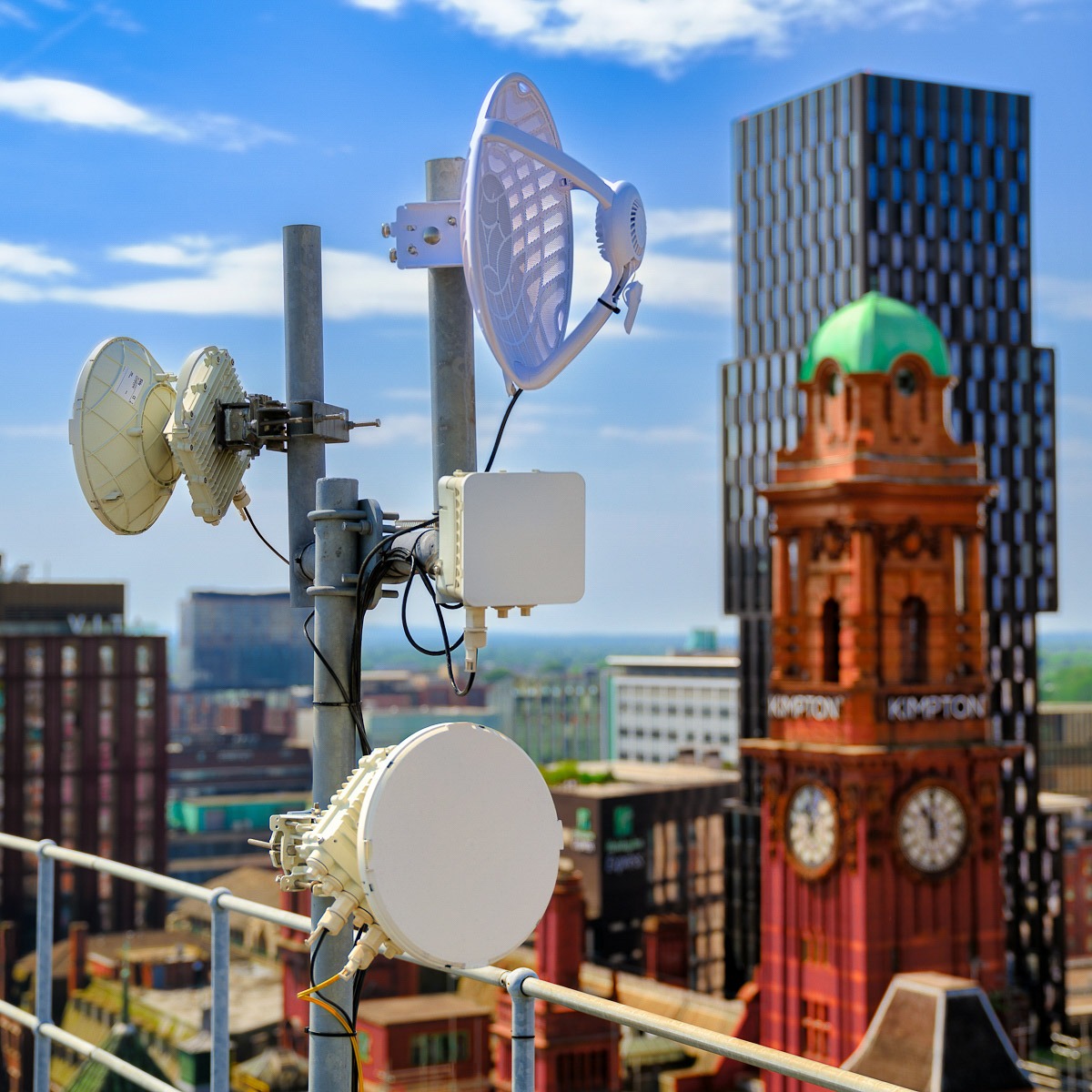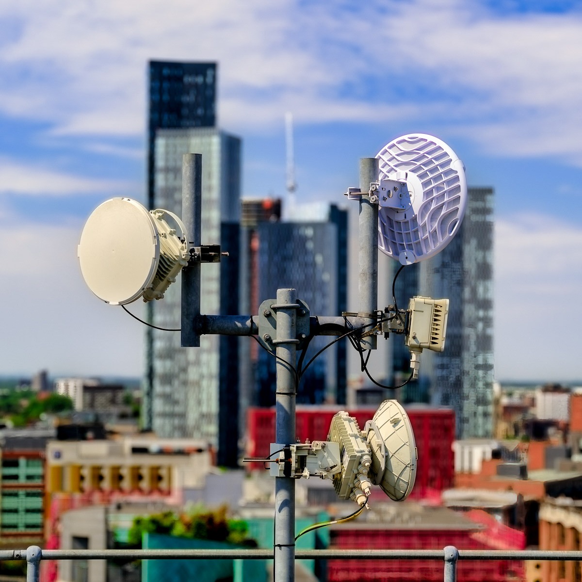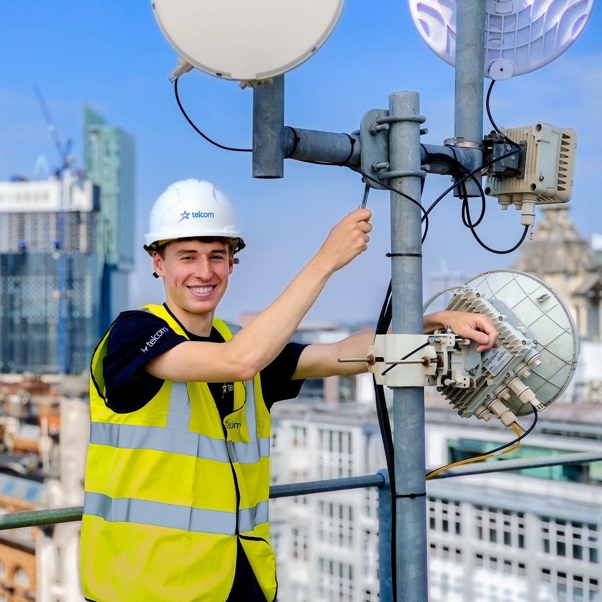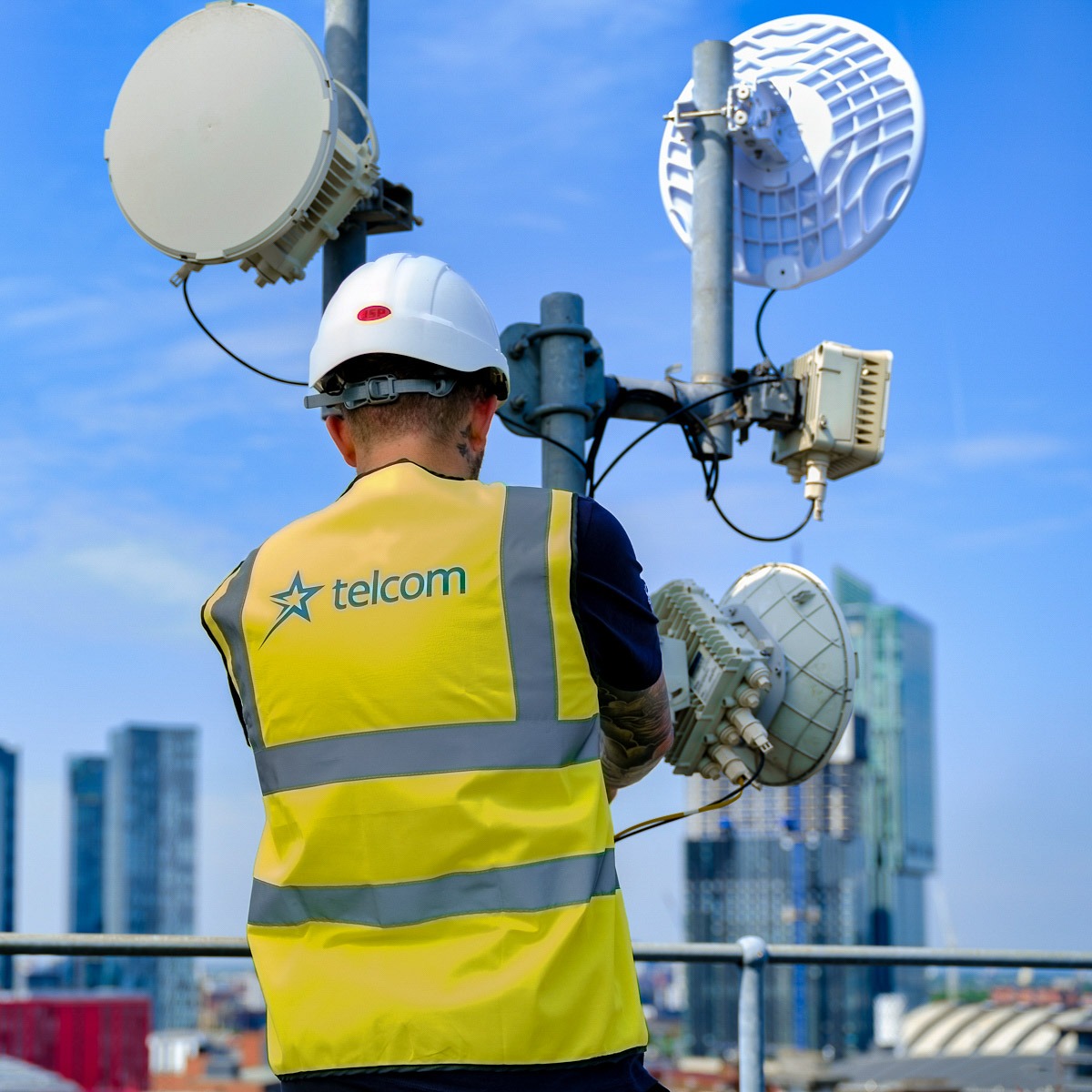 One of the most challenging yet rewarding aspects of the shoot was capturing Telcom’s wireless network aerials perched atop the city’s rooftops. Here, the aim was to showcase not just the hardware itself, but its scale and sophistication—visual symbols of Manchester’s future‑ready connectivity. By focusing the lens upward, we highlighted how elevated infrastructure supports modern urban life.